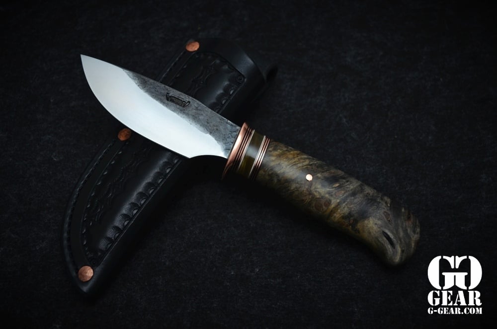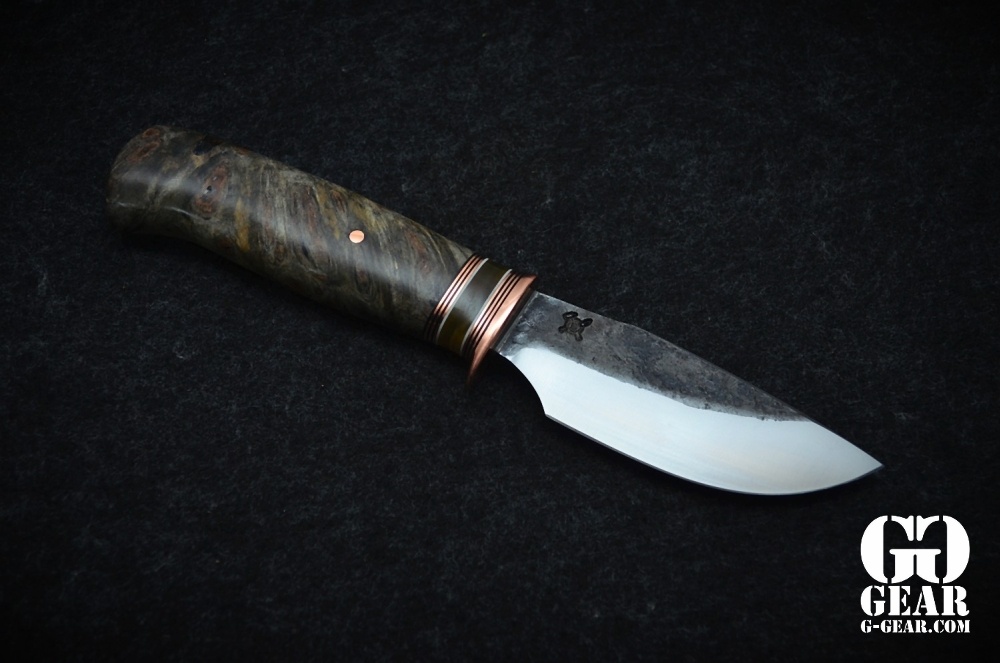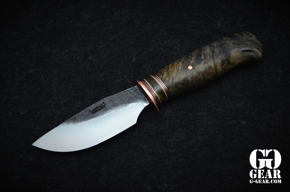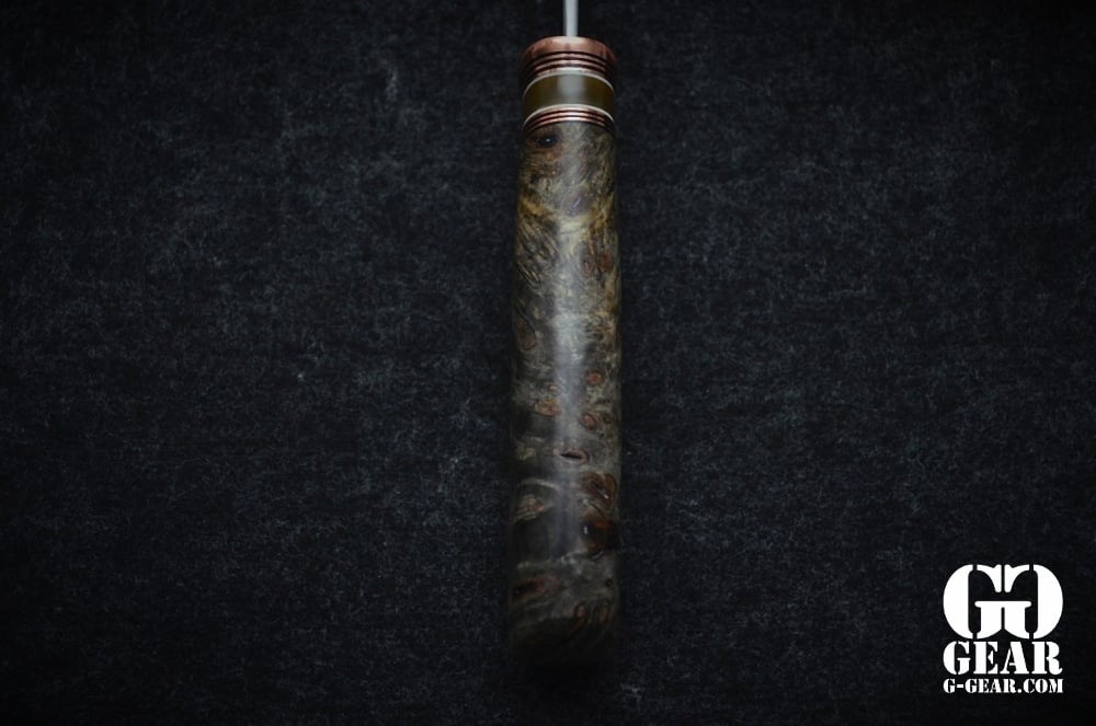 Der Griff aus Buckey Burl (Kastanien Knolle) mit einem Musk Ox Spacer der sogar farblich dem Griff folgt bietet einen traumhafte Optik mit Tiefe und perfektem Maserverlauf. Handschmeichler Garantie!
